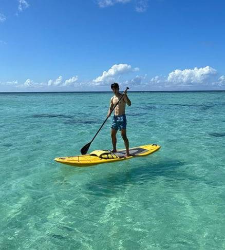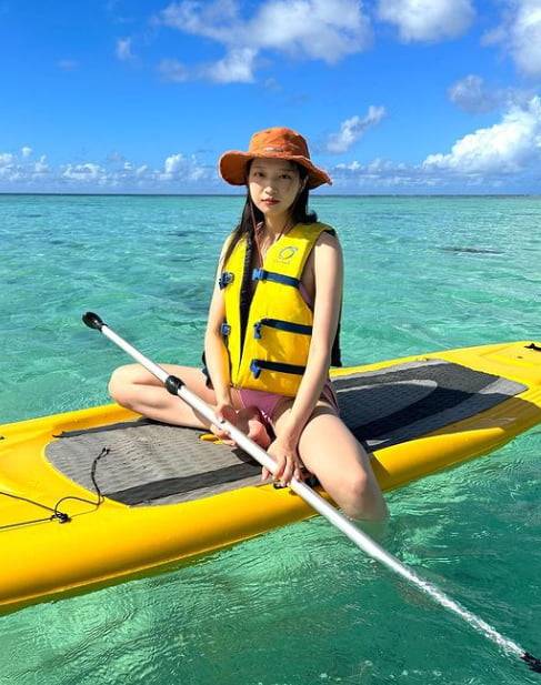 공개된 사진 속 김지연은 남자친구인 수원 삼성 소속 축구선수 전진우(개명 전 전세진)와 함께 괌에서 휴식을 취하는 모습.