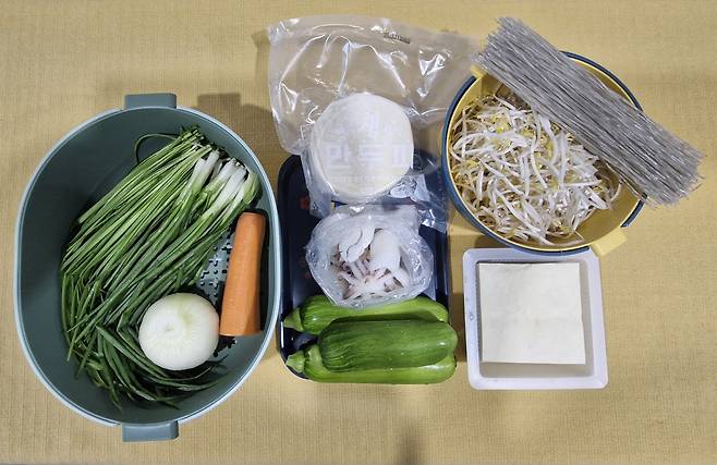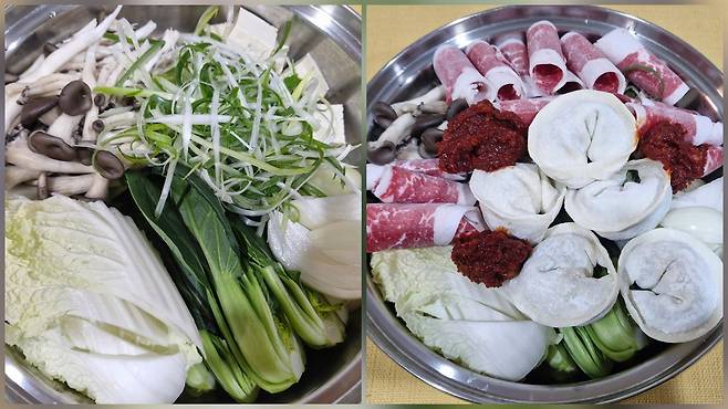 | ▲ 채소와 호박만두, 차돌박이를 가지런히 담은 전골 재료 |
