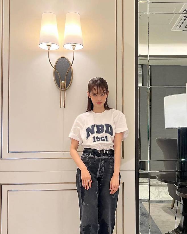 상의는 'NBD 1961' 레터링이 돋보이는 화이트 티셔츠다. 적당히 여유 있는 핏으로 자연스럽게 소매를 롤업해 캐주얼한 느낌을 더했고, 깔끔한 흰색 배경에 진한 블루 컬러 레터링이 포인트 역할을 한다. 하의는 빈티지 워싱이 들어간 흑청 데님 팬츠로, 하이웨이스트 디자인과 블랙 벨트로 허리선을 강조했다. 전체적인 실루엣은 탄탄하면서도 여유 있어 편안함과 스타일을 동시에 잡았다.