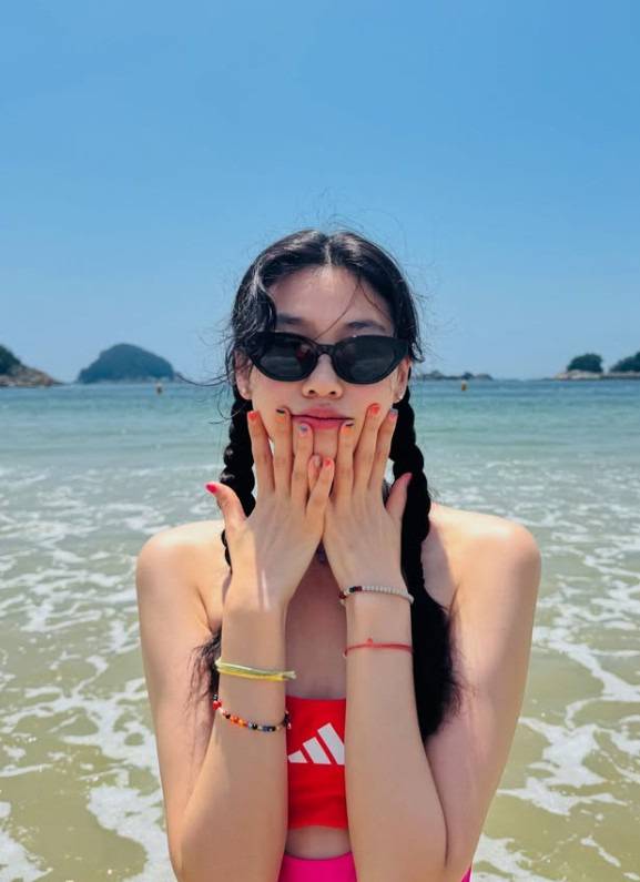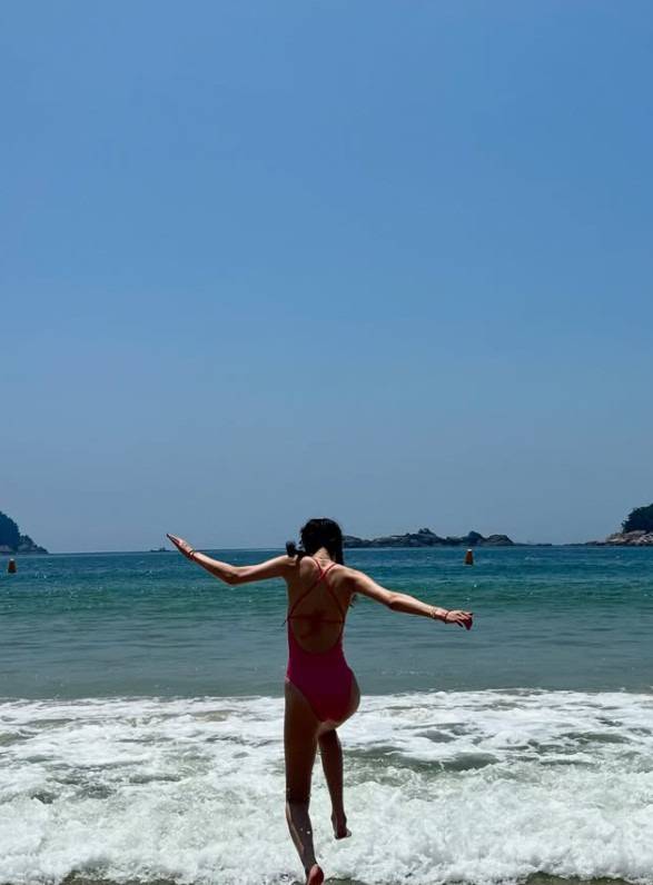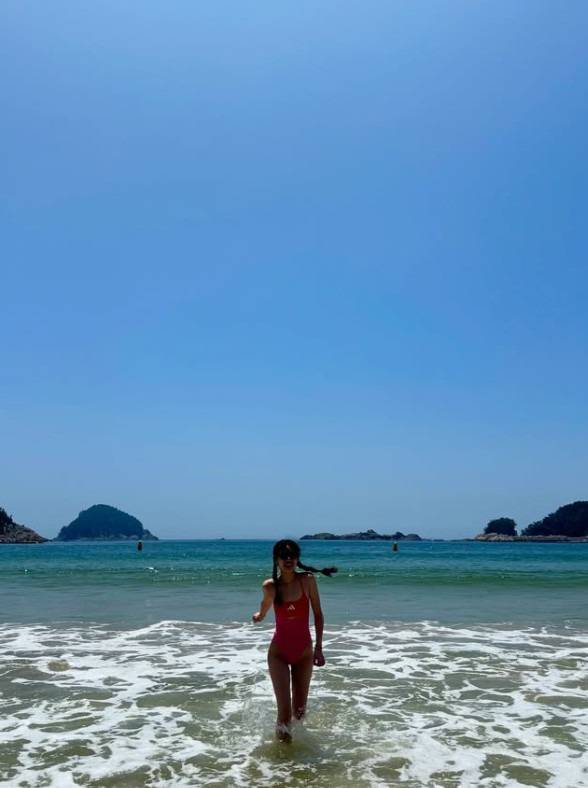 공개된 사진 속 그녀는 파스텔톤과 빨간색 모노키니를 착용한 채 햇살을 받으며 여유로운 미소를 짓고 있다.