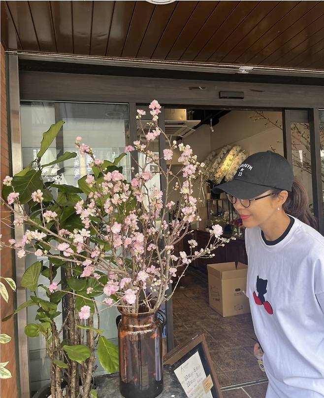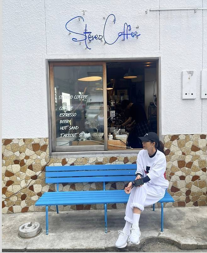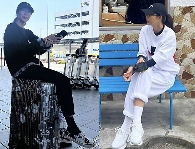 전미라는 화이트 맨투맨과 조거 팬츠 세트를 매치한 스포티한 무드를 자아냈습니다.