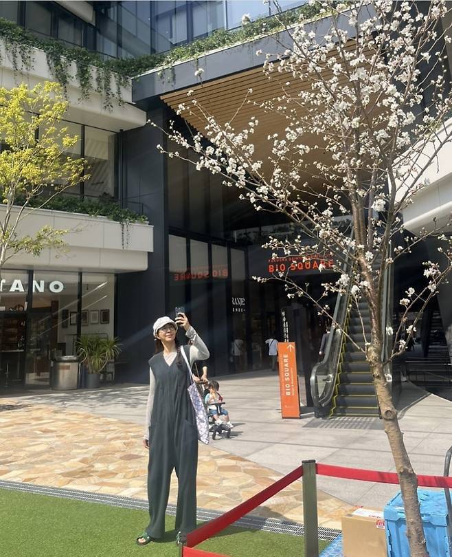 부드럽게 떨어지는 실루엣의 점프슈트는 활동성을 높이는 동시에 편안한 인상을 주었으며, 화이트 버킷햇과 플로럴 패턴 토트백으로 경쾌한 포인트를 더했습니다.