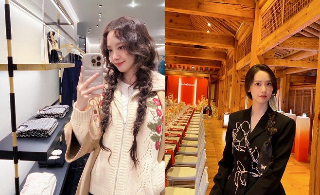 럭셔리 브랜드 매장으로 보이는 공간에서 윤아는 크림색 니트 카디건과 꽃무늬 장식이 돋보이는 로맨틱한 스타일을 연출하고 있다. 웨이브 헤어와 땋은 머리를 믹스한 헤어스타일은 로맨틱한 분위기를 한층 더 강조하고 있으며, 셀카를 찍는 모습에서 자연스러운 매력이 돋보인다. 베이지 컬러의 아우터와 크림색 니트의 조화는 따뜻하고 포근한 느낌을 주며, 꽃 모티프 장식은 윤아의 여성스러운 이미지를 더욱 부각시키고 있다.