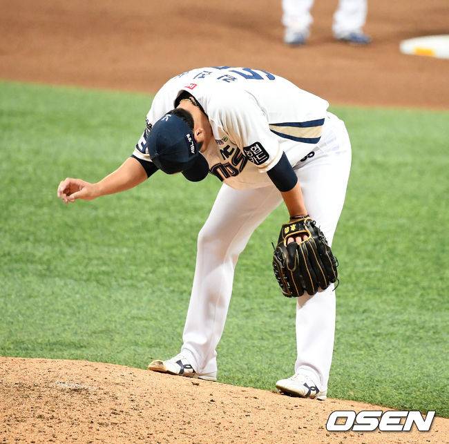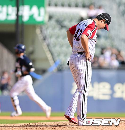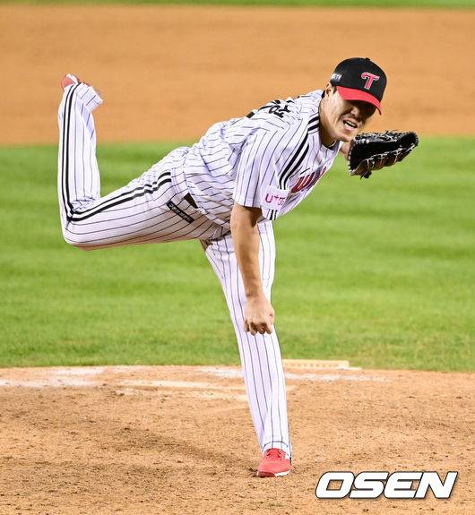 하지만 거기가 한계다. 7구째를 다시 떨어트린다. 헛스윙, 삼진 아웃. 다음 유강남은 훨씬 간단하다. 공 2개로 끝낸다. 유격수 땅볼로 이닝 종료다. 스코어 5-1은 변함없다. 임찬규가 덕아웃 앞까지 마중 나간다. 힘찬 박수로 고마움을 표시한다.
