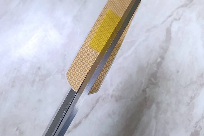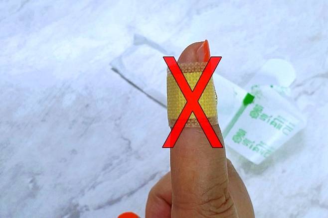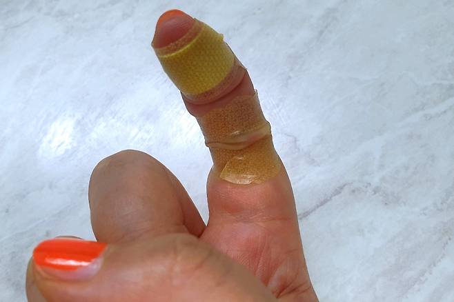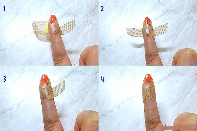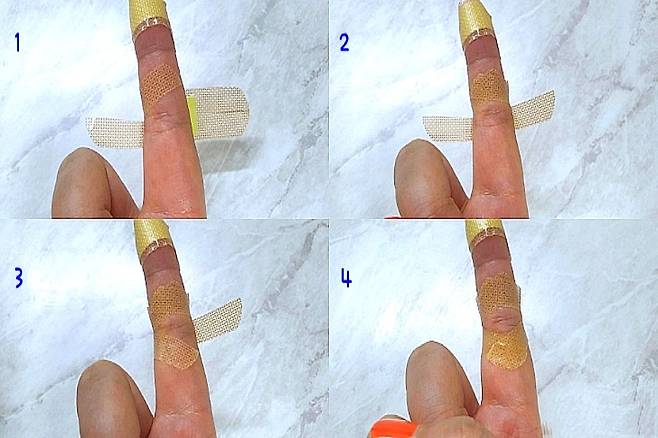 이 부분에 밴드를 붙이면 손가락 구부릴 때 불편할뿐더러 금방 떨어지는데요. 이때도 처음처럼 밴드 양쪽 끝을 잘라주시고 위의 사진처럼 순서대로 붙여주세요. 이때 마디 부분은 피해 X자로 붙여주세요.