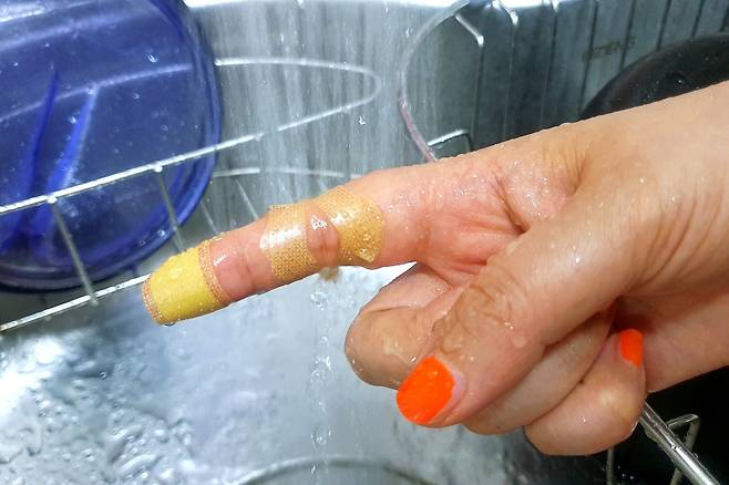 물에 젖어도 안 떨어져요! 밴드 붙이고 집안일해도 안 떨어지니 평소보다 밴드 절약할 수 있었어요! 아이들 손가락에도 이렇게 붙여주면 떨어지지 않으니 좋답니다^^*