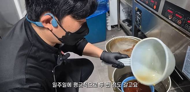 가게에 오면 가장 먼저 기름을 갈려고 합니다. 주방은 제가 오픈을 혼자 다 하고 있고, 보통 홀까지 같이 오픈하는 경우도 있죠. 기름은 일주일에 평균적으로 두 번 정도 갈아요. 치킨이랑 튀김류가 메인이라서 좀 자주 갈아줘야 합니다.