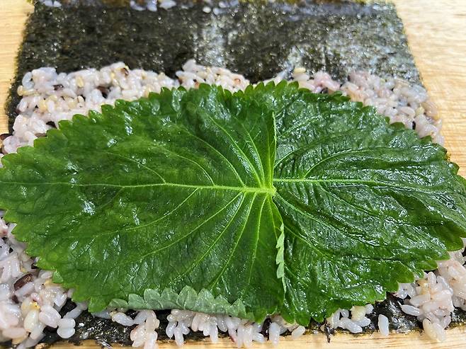 김 위에 밥을 최대한 얇게 깔고 깻잎도 2장 올립니다. 어묵 김밥에 깻잎을 넣으면 향긋해서 조합이 아주 좋습니다.