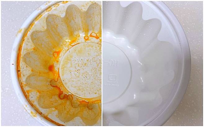 비교 사진입니다. 엄청 깨끗해져서 집에서 재활용해도 되겠더라고요. 고추기름 범벅인 포장용기 밀가루로 쉽게 세척해 버려 주세요^^*
