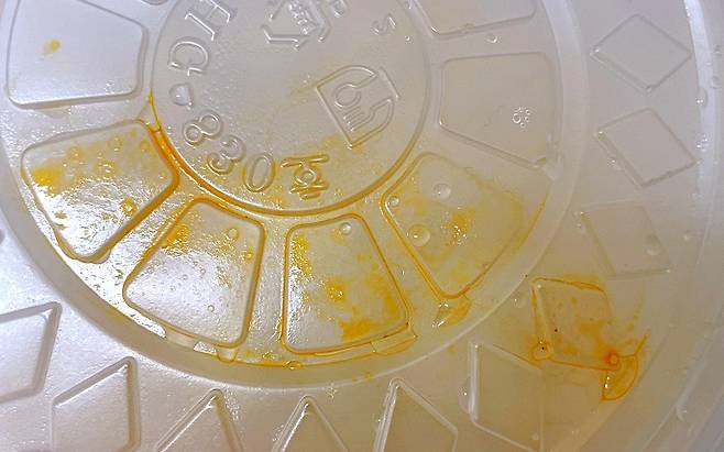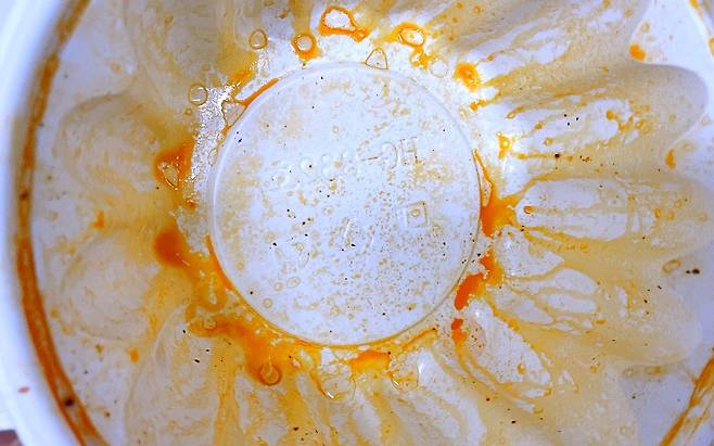 감자탕을 먹고 나니 포장용기에 고추기름이 범벅인데요. 고추기름은 그냥 물로만 씻어내면 지워지지 않더라고요
