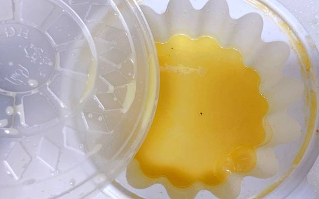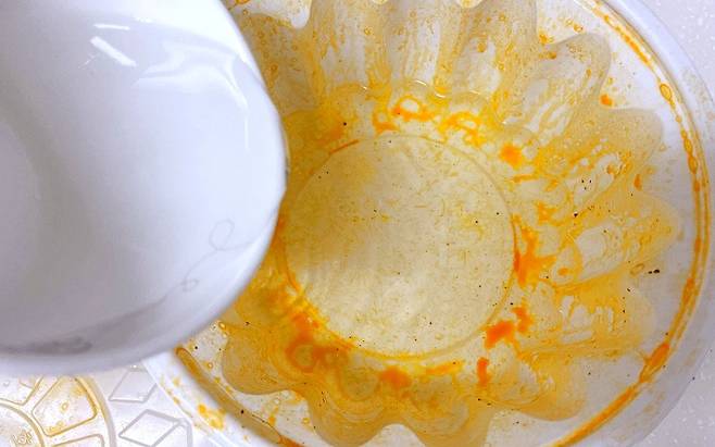 잠시 후 뚜껑을 열어보면 놀랍게도 고추기름이 다 제거되었더라고요. 밀가루가 효과적인 이유는 밀가루의 녹말이 촘촘한 그물 형태라 흡착력이 뛰어나기 때문이라네요.
