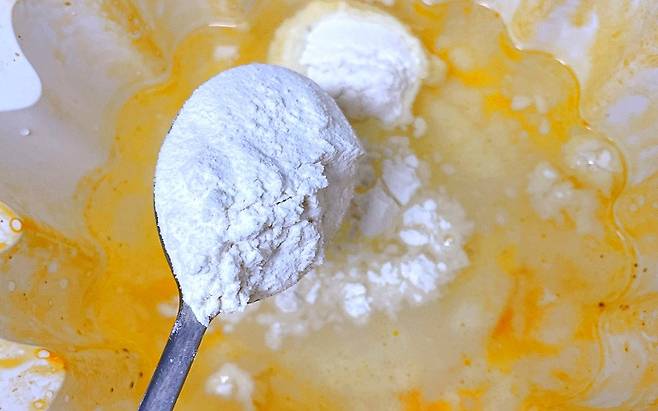 그다음 오늘의 주인공 밀가루를 준비합니다. 유통기한 지난 밀가루를 활용하시면 더 좋겠죠. 밀가루는 오염 정도에 따라 1-2스푼 넣어주세요.