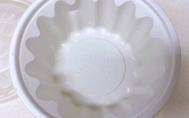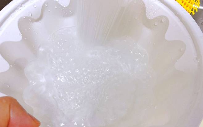 이럴 때 세제 없이 아주 쉽게 세척하는 꿀팁이 있는데요. 먼저 포장용기에 따뜻한 물을 절반 부어주세요. 찬물보다는 따뜻한 물이 효과적이에요.