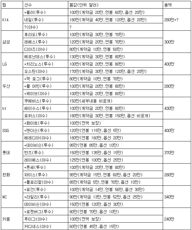 3명의 외국인 선수를 모두 교체한 두산 베어스와 2명을 바꾼 한화 이글스는 280만 달러씩을 썼다.