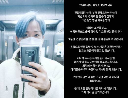 [전문] "1년간 병원 투어하다 췌장암 소견, 최악 상황 생겨도…" 인기 웹툰 작가 박형준 고백