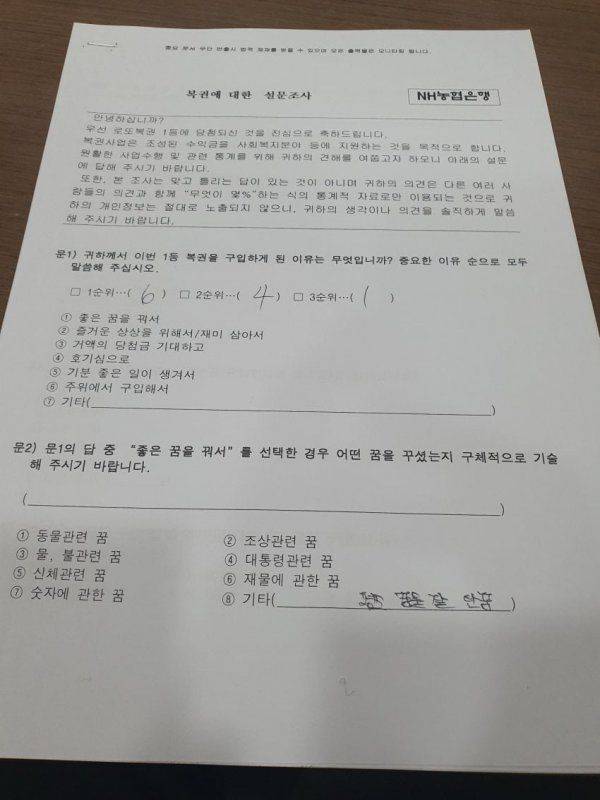 이 구매자는 복권을 구입하게 된 이유에 대해 “1. 주위에서 구입해서”, “2. 호기심으로”, “3. 좋은 꿈을 꿔서”라고 답했다.