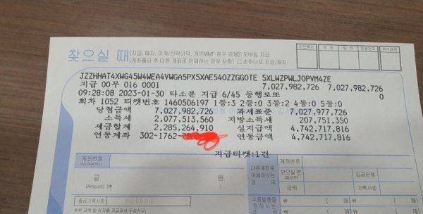 그는 당첨금 수령 영수증도 공개했다. 30일 오전 9시 28분 수령했고, 총 당첨 금액은 70억2798만2726원으로 표기돼 있다. 동행복권 홈페이지에 게시된 1052회 당첨금의 합과 같다. 세금을 제한 실지급액은 47억4271만7816원이다.
