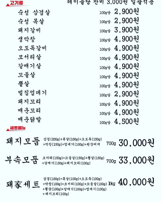 탕후루 하나에 3000원인 시대에, 숙성 삼겹살 100g당 2900원이라면 믿겠는가. 심지어 숙성 목살 2900원, 돼지갈비 3900원, 생막창, 오도독갈비, 모서리살, 갈매기살, 꼬들살, 뽈살 등 인기 많은 부속 고기도 100g에 5000원을 넘지 않는다. 1인분 평균이 180~200g이라고 봐도 삼겹살 1인분이 6000원이 넘지 않는 셈. 합리적인 가격의 비결은 셀프바를 통해 인건비를 최대한 아끼고, 마진을 최대한 남기지 않는 선에서 제공한다고. 단순히 가격만 저렴한 게 아니라 숙성된 고기 맛까지 뛰어나 수원 주민에게 사랑받는 곳이다. 테이블당 3000원의 찬비가 있으니 참고할 것.