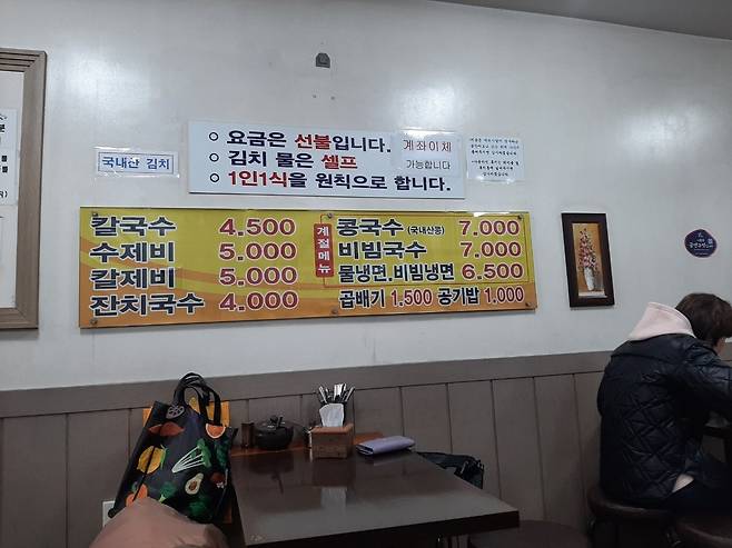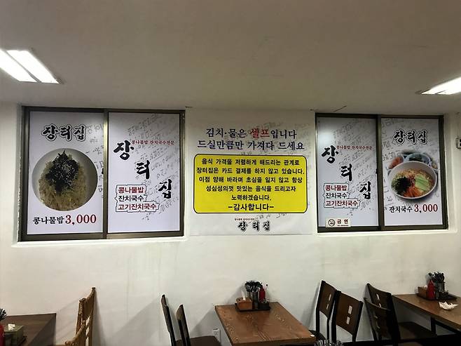메뉴판을 보면 '이 가격이 가능할까' 의심부터 든다. 멸치국수, 콩나물밥 3000원,장터집국밥 4000원, 양평해장국 6000원이다. 두 가지 메뉴를 시켜도 만 원 한 장으로 해결되는 셈. 심지어 공깃밥 리필까지 가능하다. 그렇다면 맛은 어떨까. 40년 경력의 한식 조리장이 직접 조리하고, 엄선한 밴댕이와 대멸을 넣고 오랜 시간 직접 끓인 육수를 사용해 전통적인 맛이 느껴진다. 사장님이 혼자 운영하니 김치와 물, 식기 반납 등 소소한 일은 셀프다.