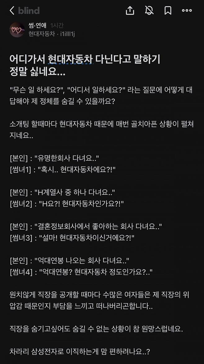 폐쇄형 온라인 커뮤니티 블라인드 썸연예 게시판에는 최근 현대차에 근무하는 것을 인증한 네티즌이 ‘어디 가서 현대자동차 다닌다고 말하기 정말 싫네요’라는 글을 올렸다.
