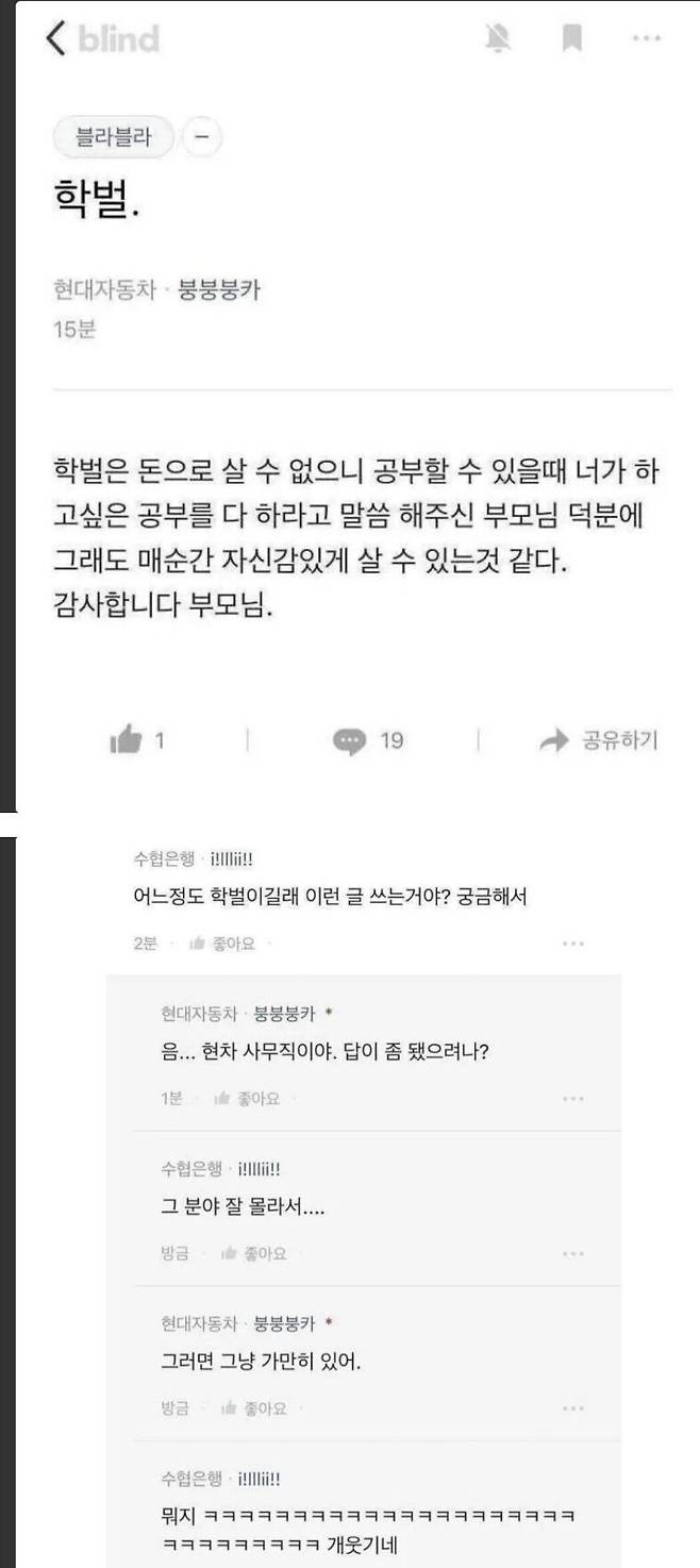 당시 한 현대차 근로자는 자신의 학교를 밝히지 않은 채 “하고 싶은 공부를 열심히 한 덕분에 매 순간 자신 있게 산다”라는 글을 블라인드에 올렸다.