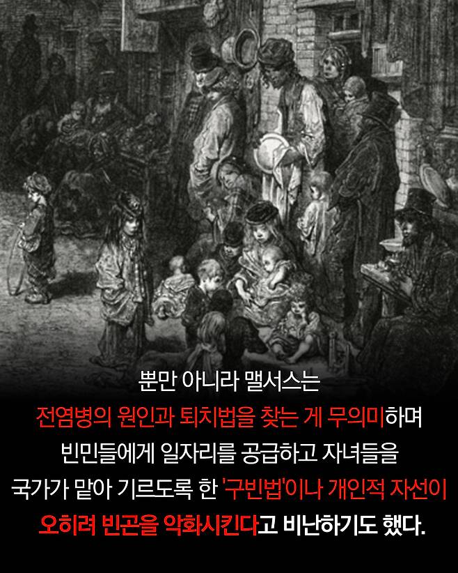 인구문제는 해결이 불가능하기에 하층민의 고통을 개선하려는 노력을 해서는 안 된다, 그들의 고통은 스스로의 책임이라고 주장했습니다.
