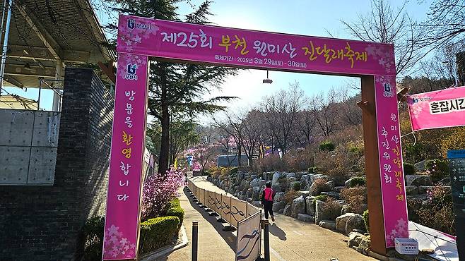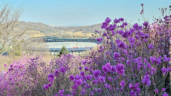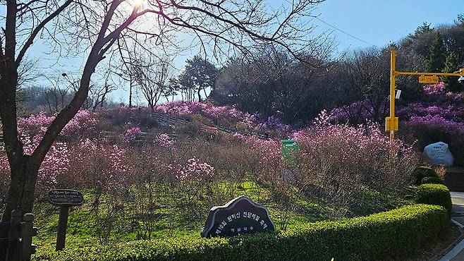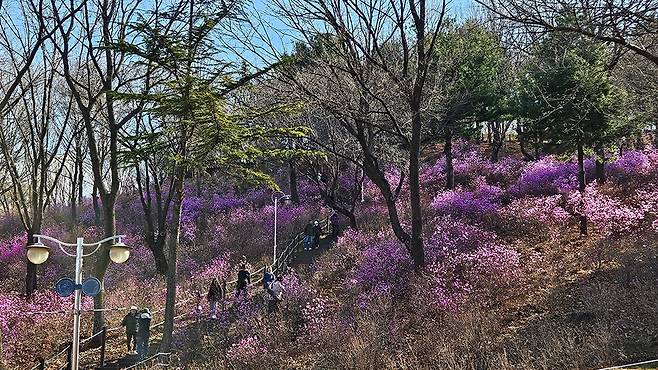 전국적 진달래 군락지로는 황매산, 소요산, 대둔산, 고려산, 천관산, 비슬산, 두타산 등이 있습니다. 모두 가보고 싶은 곳이지만 대부분 산행을 해야 하는 곳들로 가보기가 쉽지는 않습니다. 진달래가 보고 싶을 때 나들이로 훌쩍 다녀올 수 있는 곳이 서울 근교에 있습니다. 부천 원미산 진달래 동산인데요, 부천시와 시민들이 여러 해를 거쳐 조성한 동산입니다. 부천 종합운동장 바로 옆에 위치한 원미산에 조성된 곳으로, 지하철 7호선 부천종합운동장역 2번 출구에서 약 450m 정도만 오면 입구가 나옵니다.