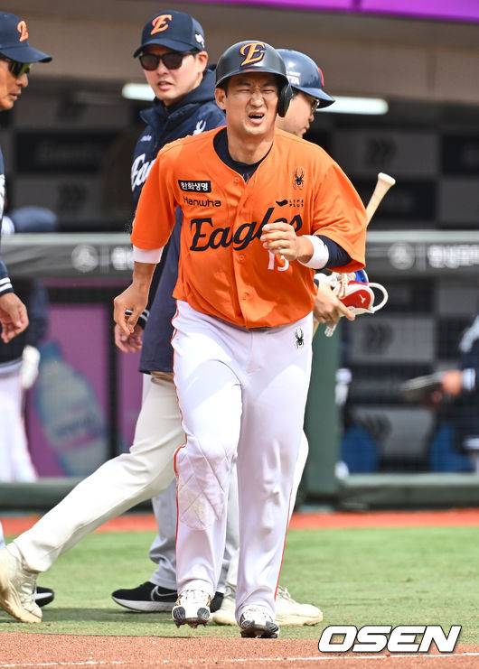 한화 이글스 최재훈이 2회초 1사 만루 롯데 자이언츠 선발 투수 데이비슨의 투구에 맞고 괴로워하고 있다. 2025.03.13 / foto0307@osen.co.kr
