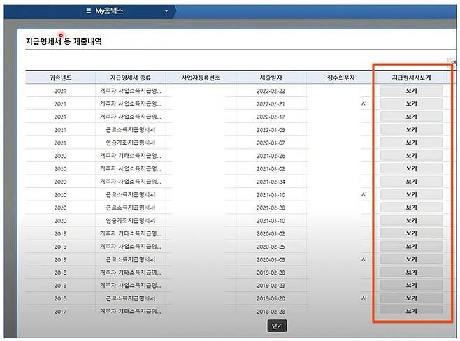 여기서 조회되는 내역은 현재 시점으로부터 최근 5년 치의 내가 지급받은 소득의 원천징수영수증을 조회할 수 있는데 그 중 귀속 연도와 지급명세서, 제출 일자를 보고 필요한 자료를 선택하면 된다. 참고로 화면에서 보이는 지급명세서가 원천징수영수증과 같은 말이라고 이해하면 된다. 같은 자료를 국세청에 제출할 때는 지급명세서라고 하고 소득자에 발급할 때는 원천징수영수증이라고 쓴다.