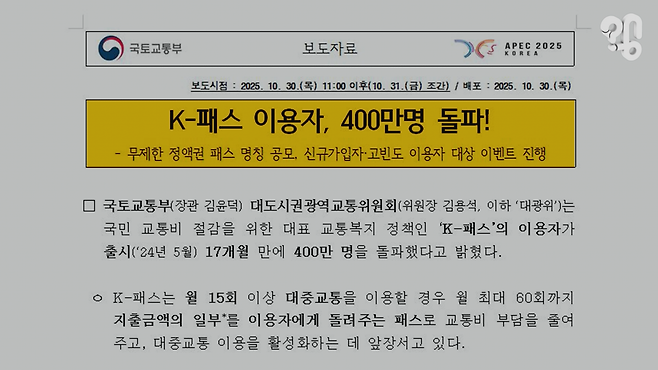 또 K패스 제도는 월 15회 이상 정기적으로 시내버스와 지하철을 이용할 경우최소 20%부터 청년은 30%, 저소득층은 53% 할인을 지원한다. 해당 사업의 목적은 국민의 교통비 부담 완화도 있지만 대중교통 활성화도 중요한 정책 목표 중 하나라고 한다.