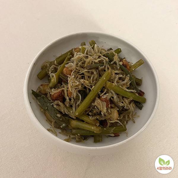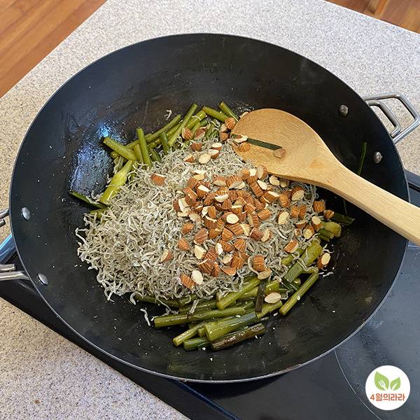 주재료: 마늘쫑 200g, 잔멸치 50g, 통아몬드 30g