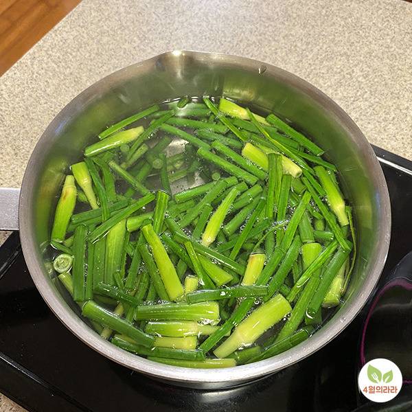 → 끓는 물에 소금을 약간 넣고 손질한 마늘쫑을 넣어 30초~1분 정도 살짝 데쳐줍니다. 데친 마늘쫑은 바로 찬물에 헹궈 물기를 빼주세요.