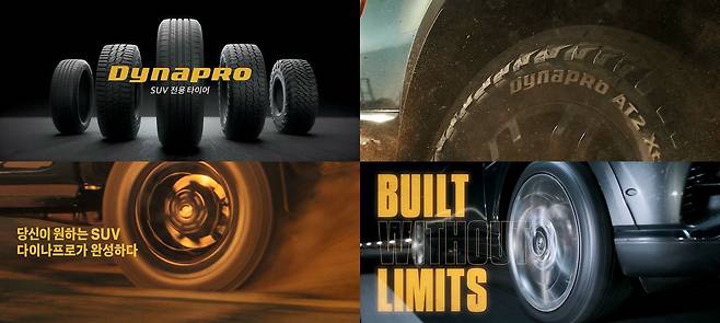 영상에는 SUV 전용 프리미엄 컴포트 타이어 ‘다이나프로 HPX(Dynapro HPX)’와 온·오프로드 SUV용 전천후 타이어 ‘다이나프로 AT2 익스트림(Dynapro AT2 Xtreme)’이 등장한다. SUV 특유의 역동성을 강조하는 질주 장면을 연출하며, 온·오프로드에서 발휘되는 ‘다이나프로’의 고성능 퍼포먼스를 입체적으로 보여준다.