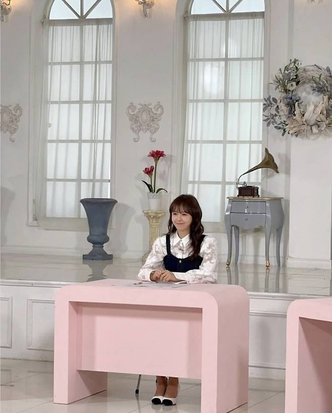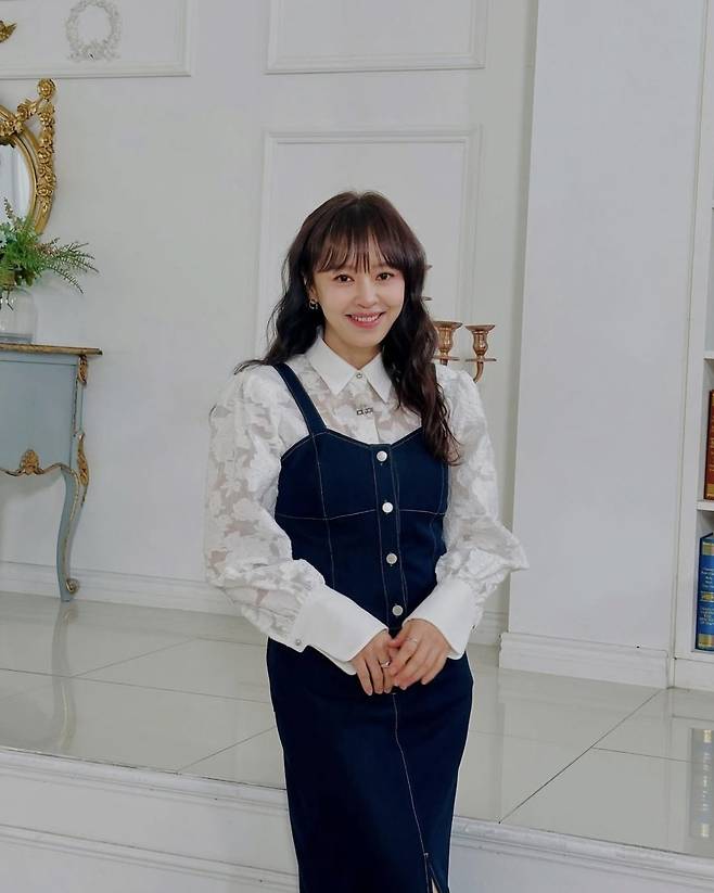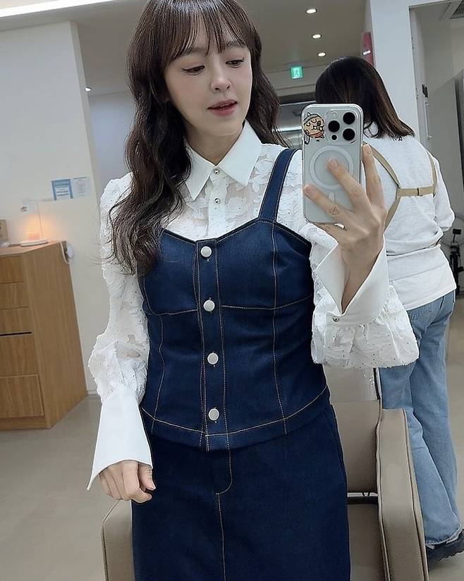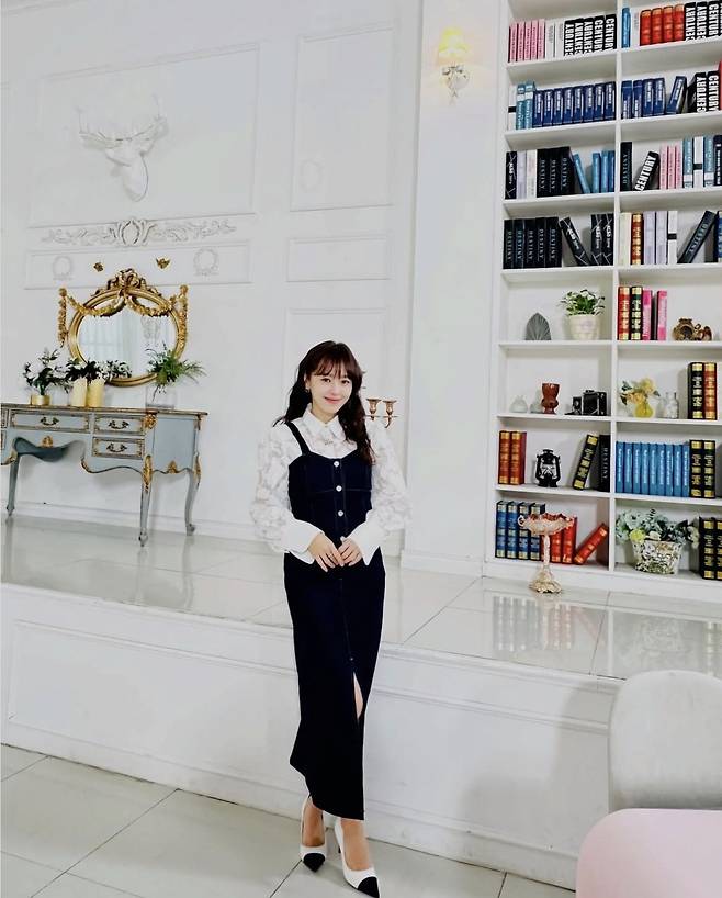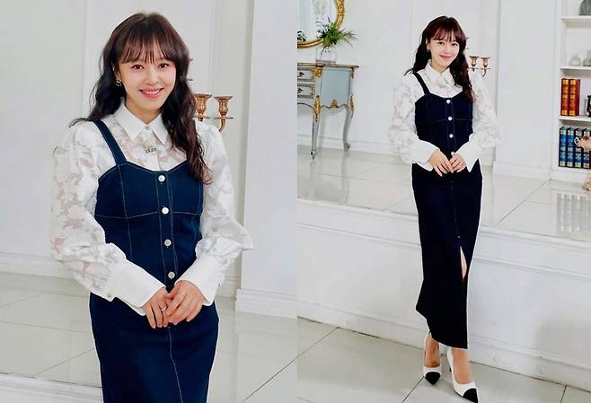 강성연은 화이트 레이스 블라우스에 딥 인디고 컬러의 데님 원피스를 레이어드해 클래식하면서도 트렌디한 스타일을 완성했다.