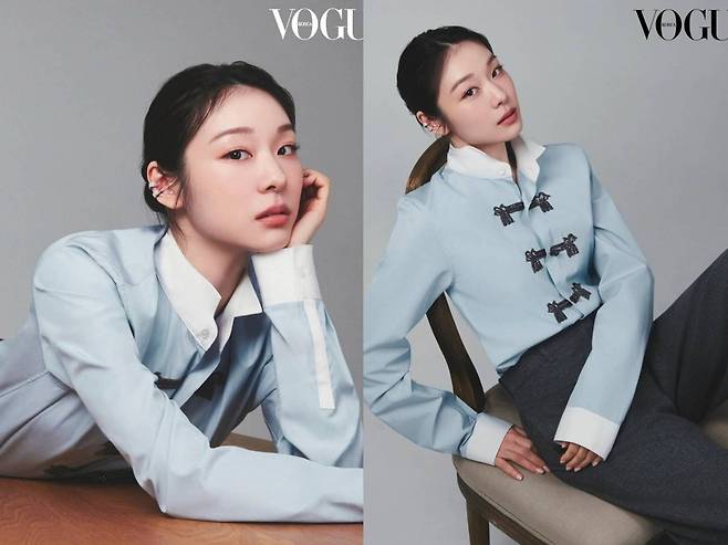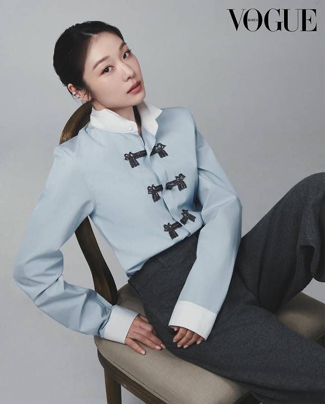 김연아는 하늘색 셔츠에 화이트 칼라와 커프스를 또렷하게 세워 클래식한 인상을 만들고, 리본 장식 디테일로 은근한 위트를 더했습니다.