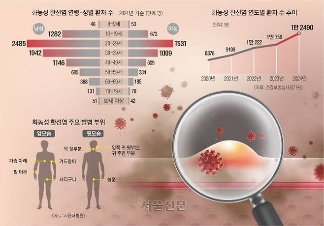 17일 건강보험심사평가원에 따르면 화농성 한선염 환자는 2020년 8378명에서 지난해 1만 2490명으로 약 49% 증가했다. 질환의 인지도가 낮은 데다 민감한 부위에 발생해 진료를 미루는 경우가 많다는 점을 고려하면 실제 환자 수는 더 많을 것으로 추정된다. FT아일랜드의 멤버 이홍기씨가 “중학생 때부터 앓았지만 종기인 줄 알고 8번이나 수술했다가 최근 병명을 알았다”고 밝혀 화제가 된 바 있다.