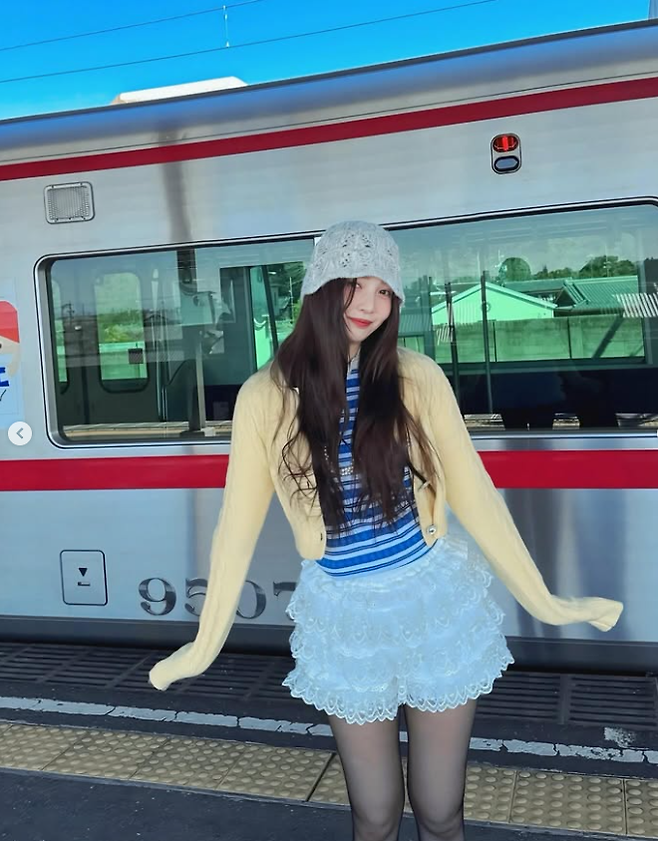 레드벨벳 조이의 가디건 코디에요.