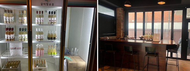1층에 들어서면 다이닝 공간 겸 판매 공간이 나타난다. 이곳에서 판매 중인 모든 술은 같이 양조장에서 직접 만든 술들이다. 칵테일 ‘모히또’를 표현한 민트 막걸리부터 멜론을 사용한 멜론 막걸리, 전통주 ‘하향주’와 홍차 잎을 활용해 만든 술까지 다양하다. 고소한 탁주에 향긋함과 감칠맛을 더해 어디서도 볼 수 없는 특별한 술로 재탄생했다.