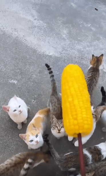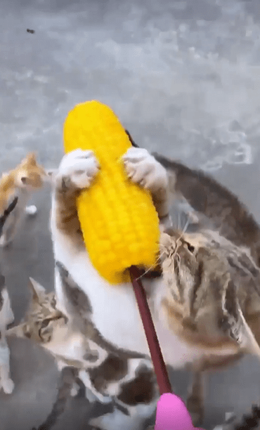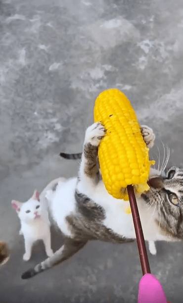 그러던 찰나, 고양이 무리 중 한 마리가 갑자기 튀어 오릅니다. 전혀 망설임 없는 점프, 앞발도 펼치지 않고 오직 입 하나에 모든 걸 건 채, 옥수수를 향해 돌진합니다. 그리고 그 순간—덥썩. 고양이는 허공에서 옥수수를 정확히 물어버립니다. 착지할 생각도 없습니다. 놀랍게도, 그 고양이는 공중에 떠 있는 채로 옥수수를 물고 그대로 ‘냠냠냠’을 시작합니다.