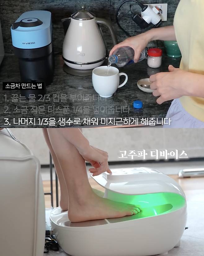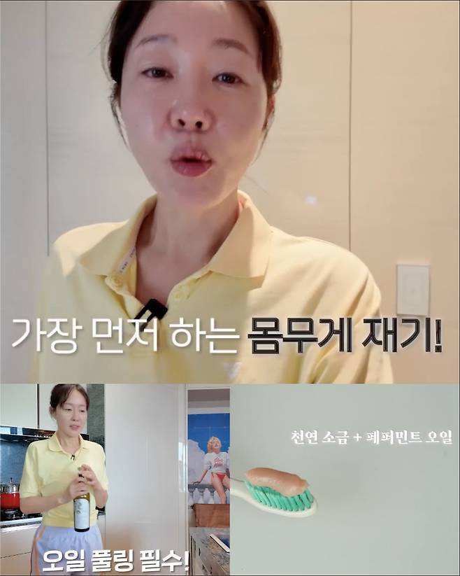 체중을 기록하며 하루를 시작하고, 식물성 오일로 입안을 헹구는 오일 플링으로 노폐물을 제거했습니다. 이어 유기농 소금 치약으로 양치한 뒤, 따뜻한 소금차 한 잔으로 위장을 부드럽게 깨웠습니다. 피부 관리에도 철저했는데, 고주파 디바이스와 클렌징 워터 세안을 거쳐 비타민C 앰풀, 아이크림, 크림과 오일 블렌딩으로 스킨케어를 마무리했습니다.