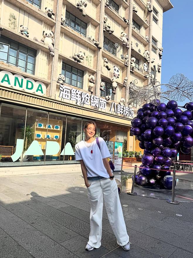 밝은 햇빛, 판다 조형물이 잔뜩 달린 킥한 배경,
