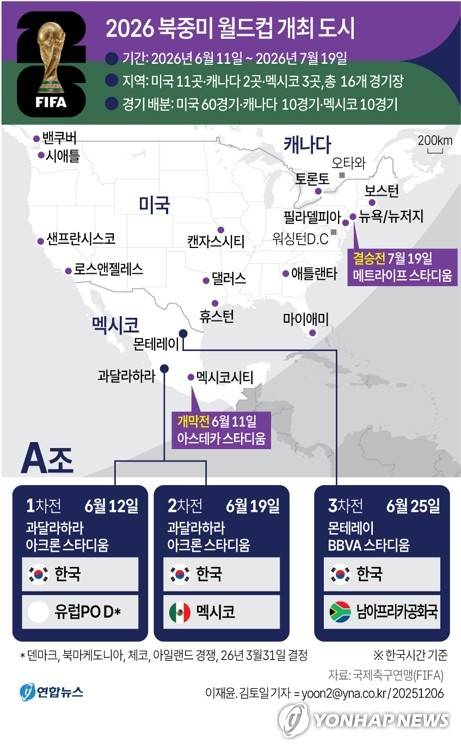 우리시간 내년 6월 12일 멕시코 과달라하라 아크론 스타디움에서 유럽 PO 패스D 승자와 1차전을 치르고, 19일 같은 곳에서 멕시코를 상대한다.