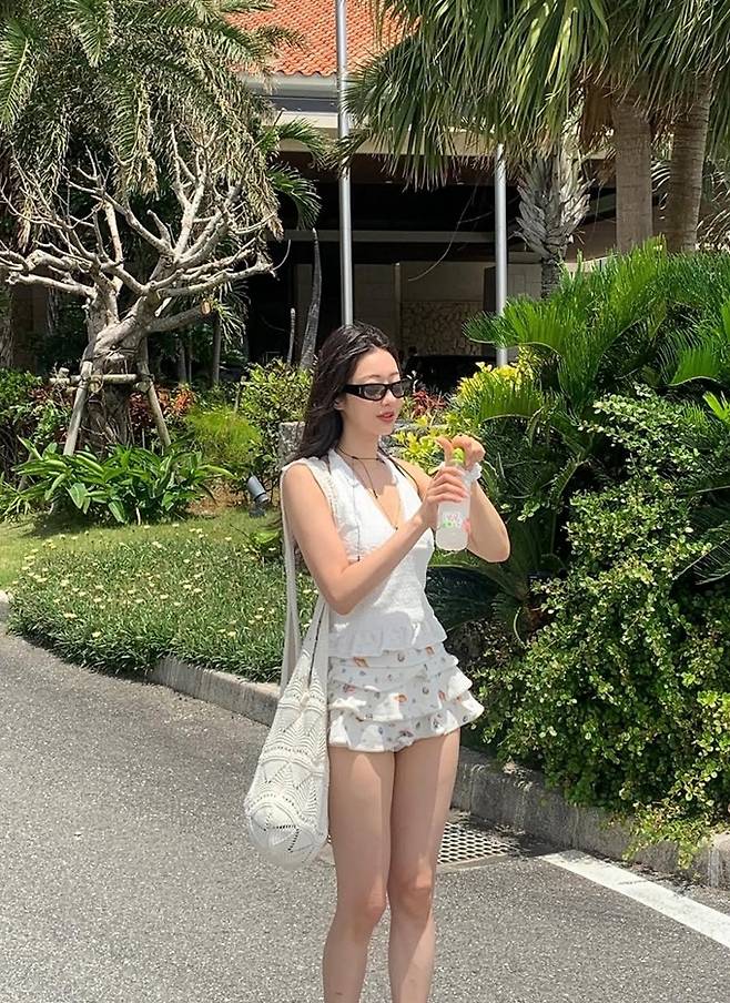 공개한 사진에서 경리는 이국적인 풍경을 배경으로 짧아도 너무 짧은 초미니 티어드 스커트에 흰색 레이스 디테일이 들어간 민소매를 매치한 핫한 스타일로 휴양지룩을 완성했다.