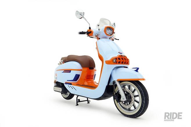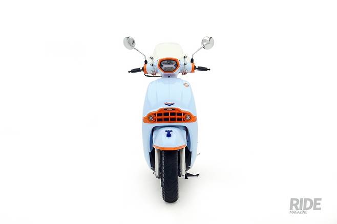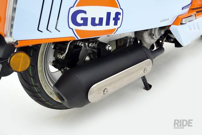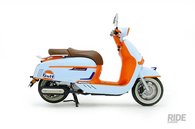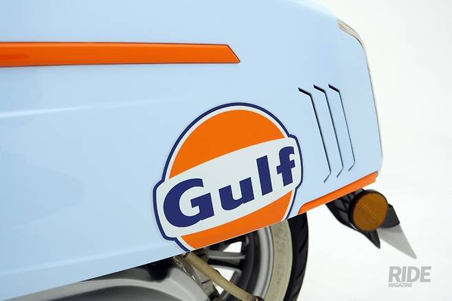 클래식한 니키의 디자인은 노멀 컬러였을 때도 여타 클래식스쿠터와 비교해서 존재감이 뚜렷했는데 여기에 걸프의 컬러가 입혀지니 그 존재감은 타의 추종을 불허할 정도다. 걸프가 어떤 회사인지 모르고 리버리가 뭔지 전혀 이해를 못하더라도 일단 일반인들이 보기에도 매력적인 모습으로 변했다. 클래식한 니키의 디자인이 걸프 오일의 리버리와 잘 어울릴까 했는데 생각보다 너무 잘 어울리는 모습이다.