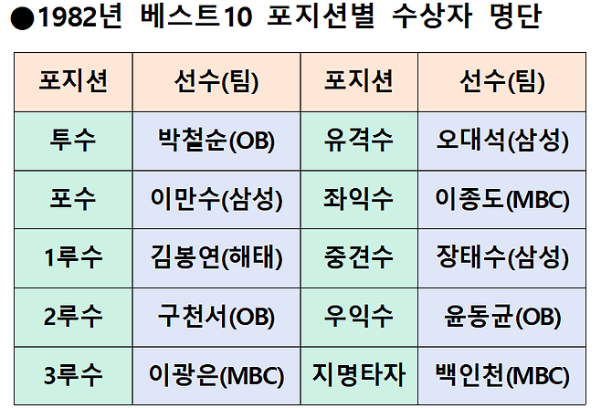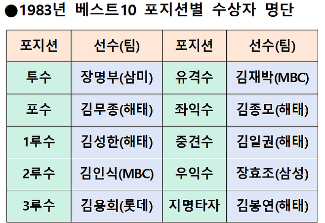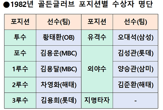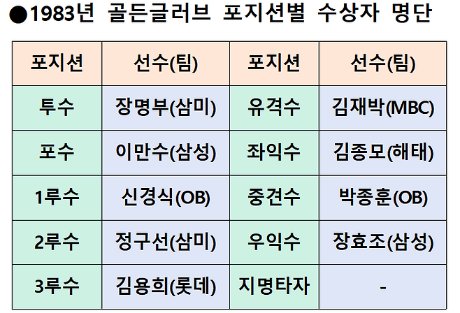 원년 최고 포수로 꼽힌 삼성 이만수, 원년 홈런왕에 오른 1루수 김봉연 이름도 없고, 지명타자 부문에 4할 타자(00.412) 백인천이 들어갈 법도 하지만 아예 수상자 명단에 없다.