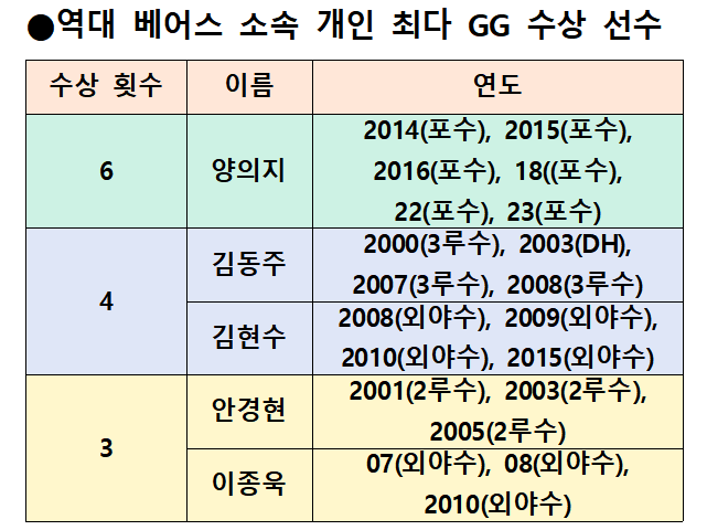 양의지는 두산 소속으로만 6차례(2014~2016년, 2018년, 2022~2023년) 황금장갑을 받아 구단 역사상 최다 수상자이기도 하다. 그러나 부상 여파가 컸던 올해는 아쉽게 후보에도 이름을 올리지 못해 이승엽의 10회 수상 기록은 단독 1위를 유지하게 됐다.
