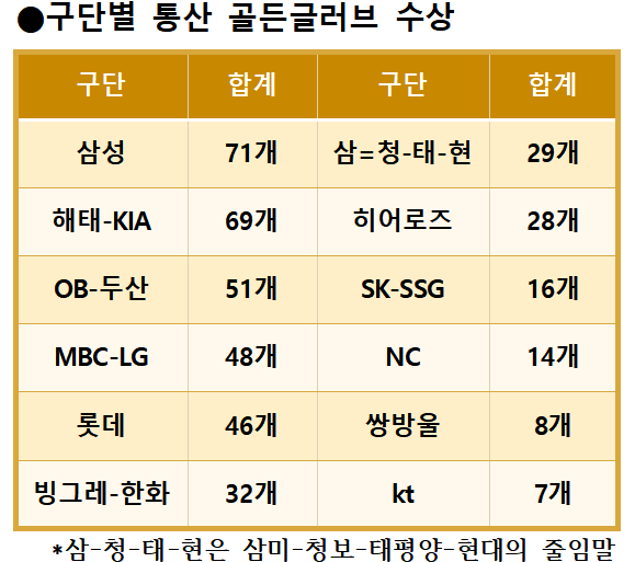 2010년대에 창단한 후발주자 NC와 kt는 지난해까지 각각 14개와 7개의 골든글러브를 쌓았다. 쌍방울은 8개의 황금장금을 품에 안은 채 역사 속으로 사라졌다.