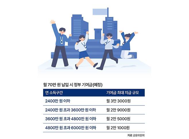 연간 총급여가 2400만 원 이하인 청년도약계좌 가입자가 만기 5년 동안 월 70만 원을 납입하면 기본금리 4.5%를 가정했을 때 매월 받게 될 정부 기여금 3만 3000원을 합해 만기 시 5061만 원을 받을 수 있습니다. 연 9.54%의 일반적금 상품에 가입한 것과 같은 효과를 얻습니다. 총급여 3600만 원 이하는 매월 70만 원 납입금에 대해 월 2만 9000원의 기여금을 받아 만기 시 4981만 원을 받습니다. 총급여 4800만 원 이하 가입자는 같은 방식으로 4956만 원을 받습니다.
