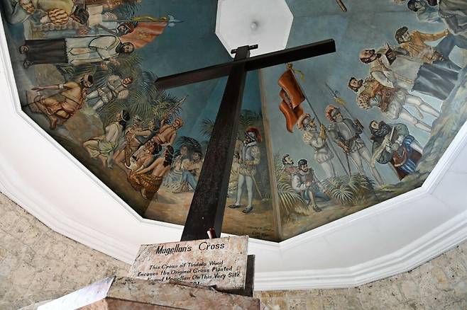 세부 시청 앞 팔각 건물 안에 마젤란 십자가가 있다. 마젤란이 세부에 처음 와서 라지후미본 추장과 그의 가족, 마을 사람들을 가톨릭으로 개종하도록 설득한 후 이를 기념하기 위해 세운 십자가다. 십자가 조각을 물에 삶아 먹으면 병이 낫는다는 미신 탓에 훼손되는 일이 잦았다. 현재는 단단한 나무로 십자가를 고정하고 손에 닿지 않게 올렸다. 여기를 지날 때 노란 옷을 입은 분들이 반갑게 맞이한다. 우리로 치면 무당 같은 역할을 한다. 돈을 내면 칼춤을 추며 재물, 학업, 건강을 기원해준다. 천장에 세례 의식을 표현한 벽화가 있어서 자세를 낮추고 카메라를 천장 방향으로 향하여 기념사진을 찍는다.