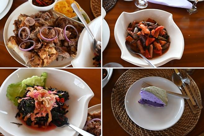 식전 음료로 나오는 코코넛 음료와 망고 주스, 그리고 후식 격 우베 케이크도 만족스러웠다. 우베는 보라색 빛 덩굴식물 마로, 퍼플 얌(Purple yam)이라고 불린다. 맛은 고구마와 비슷한데 더 달고 부드러워 밤 맛도 난다.